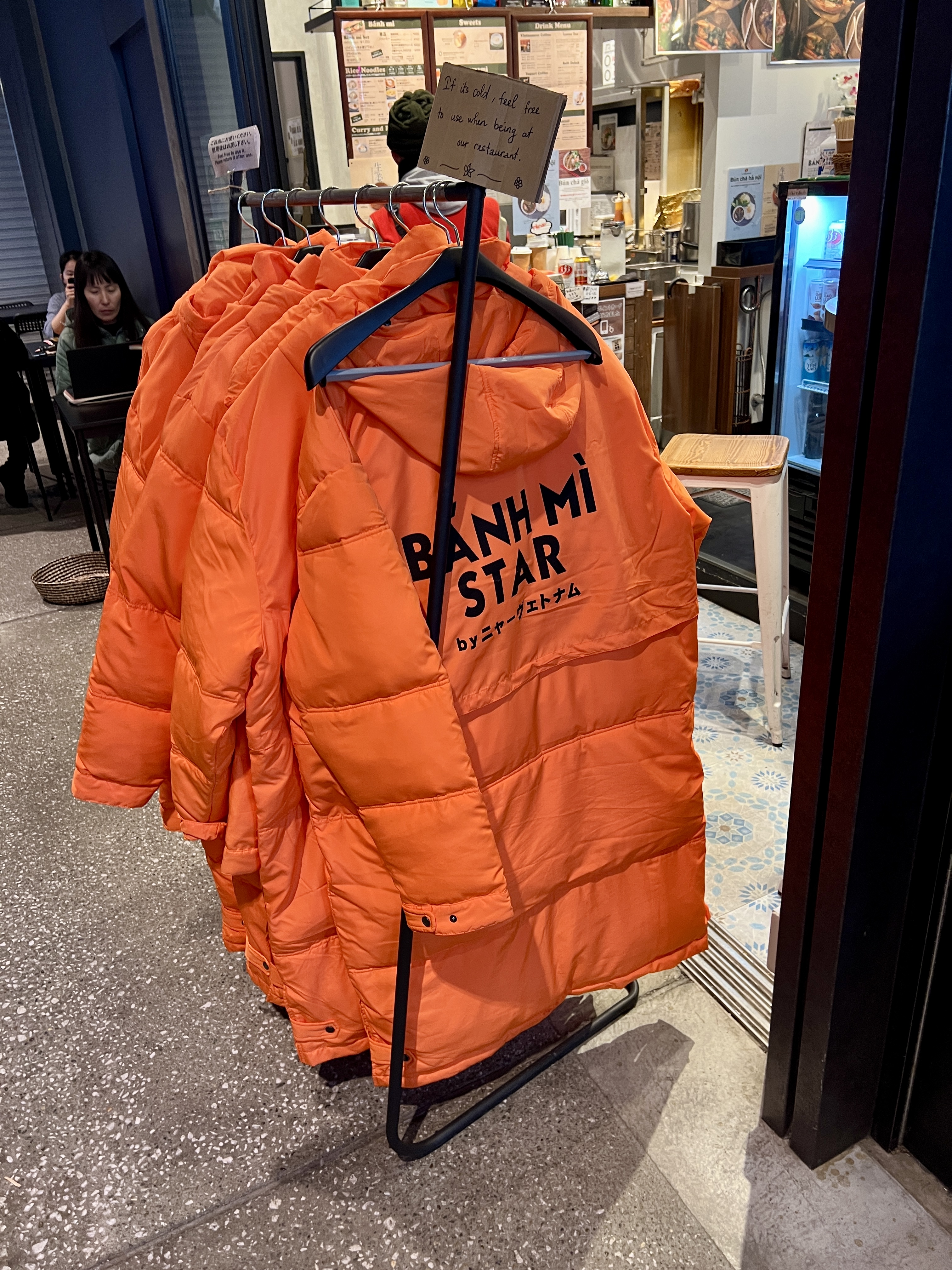 Jackets outside a Bahn Mi place for when it's a little chilly