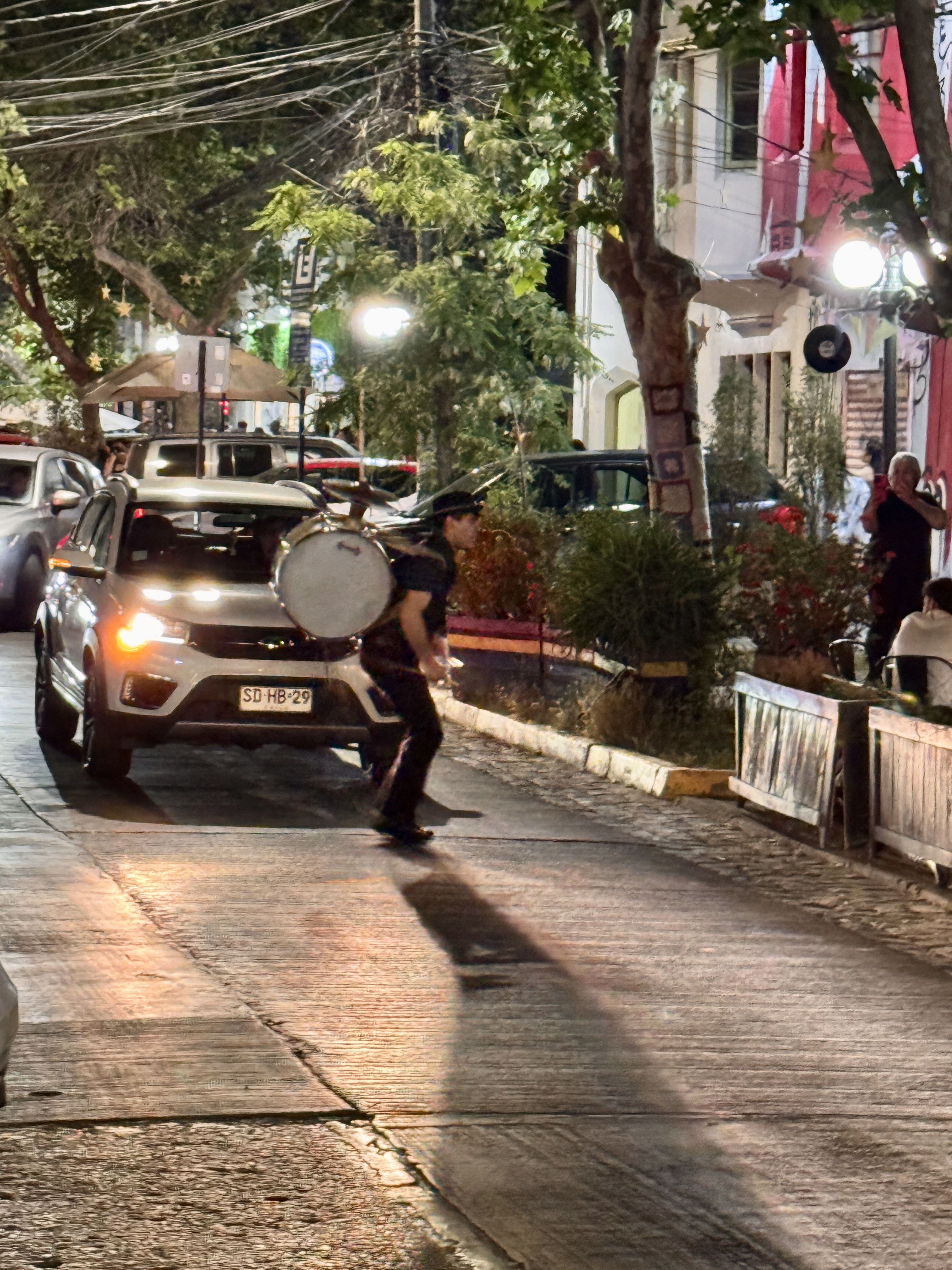 Playing the drums in traffic while we partied